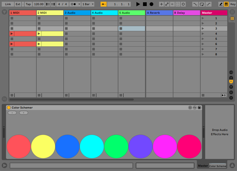 Add dynamic color themes to Ableton live. Put on any audio track, add colors and it will automatically assign those colors to your tracks and clips in session view. |