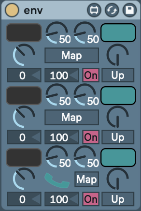 | Description: | Env is a reciever device with three envelopes that respond to pulses sent from other devices. The green boxes can also send a pulse when a stage in their envelope crosses a threshold. -now a midi device |