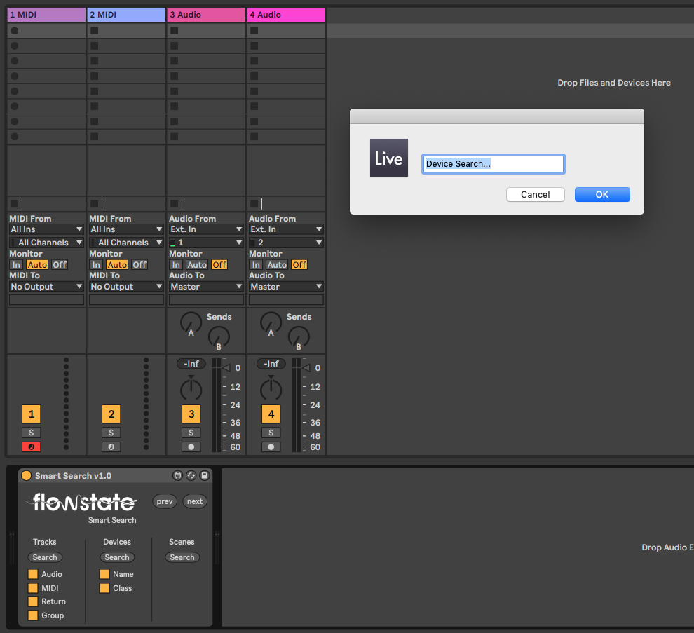 | Description: | Search your entire Ableton Live project for Tracks, Devices and Scenes. Select and shift focus to the results of the search. Filter out results depending on type. Also finds devices by original name (ie Operator, Reverb) - Even if this has been changed or a preset is being used. Device & Track search looks right down inside nested racks and groups too infinity, while expanding any folded groups or racks to show the search result. Tab through the list of results to find all items of the searched type (Tracks, Devices or Scenes) that contain the searched term. Mappable buttons or use a floating pop out window to always have instant access to search features. Release Notes: V1.01- Bugfix - Scene searching now works as expected. V1.1- Added a floating window |