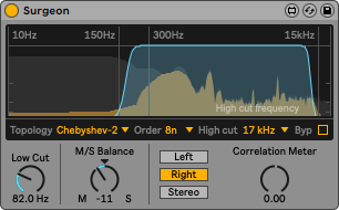 | Description: | Surgeon is a precision low and high cut eq, with adjustable low and high frequency, filter topology and filter order. The filter topology could be Butterworth and Chebyshev, the order could be from 4n to 16n. It is a really helpful little tool to remove unwanted frequencies with surgical precision. https://www.youtube.com/watch?v=qWsIcjN31tI&feature=youtu.be Version history: 1.oo - original release 2.oo - new, updated UI, larger display, M/S balance processor, mono conversion control, correlation meter 2.o1 - UI glitch fixed, device now follows correctly the selected Live theme 2.o2 - minor tweaks 2.o3 - correlation meter fixed 2.o4 - user feature request implemented - high cut filter bypass 2.o5 - Apple silicon check 2.o6 - dynamic UI 2.o7 - Live 12 compatibility check |