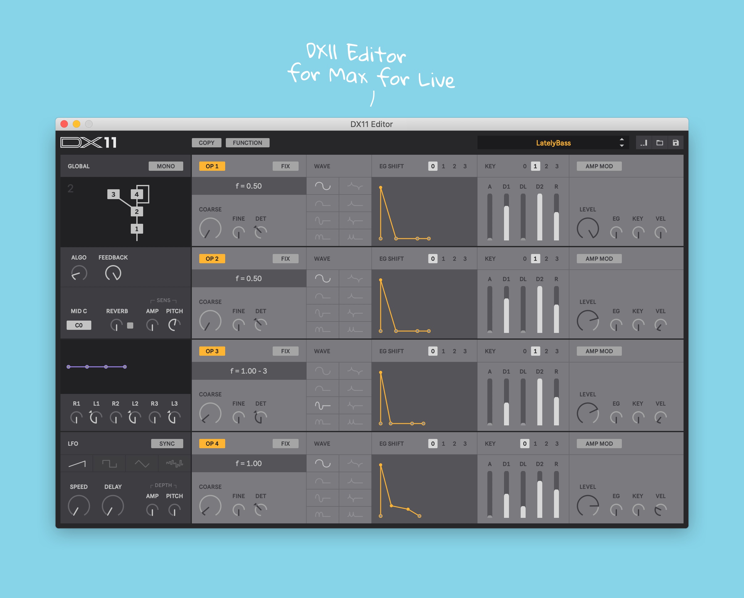 | Description: | The Yamaha DX11 is widely considered as the most advanced 4-OP synth Yamaha ever build – and rightly so! Tweak your favorite FM synth from within Ableton with this Max for Live device and enjoy some nice additional features like copy and paste, initialization and patch management. Features: - Control Yamaha DX11 hardware synth - Sysex connection between your DAW and synth to read and write patches, and to tweak all parameters from the editor in realtime - Visualization of all algorithms, waveforms and envelope shapes - Copy and paste mode to easily sync operator settings and envelopes between several operators - Routing for external controllers like mod wheel, foot and breath controller, and sustain pedal - Initialize all parameters to start from scratch - Save and load patches as single files to and from your computer and enjoy unlimited patch storage on your hard drive - Ultra compact view within Abletons device area Includes editor device file, written manual and example patches. If you have any questions or need help just send an email to: christian@detunes.net Hope you enjoy! |