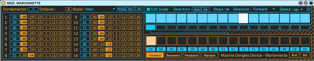 | Description: | Marionnette have been inspired by the great "White Whale" eurorack module from Monome : https://monome.org/docs/whitewhale/ i miss this beast so much into the midi world, so i create something from that with my own Mods. It's a 16 Steps Sequencer with 16 different choices of notes. You can do a selection of different notes on each Step. And this selection have is own sequencer... Madness :-) Notes are Scaled, the same you'll find in Push. Midi Inputs : C-2 Randomise the notes D-2 Randomise the Octaves E-2 Intiallise the All There's an user scale with the possiblity to change it on the fly with Midi Note from C-3 to B-3. 1.3 : correction of bug with the notes on +24. 1.2 : - correction of some functionnality that totaly kill the "undo" funtion of ableton - Better Push integration 1.1 initial release |