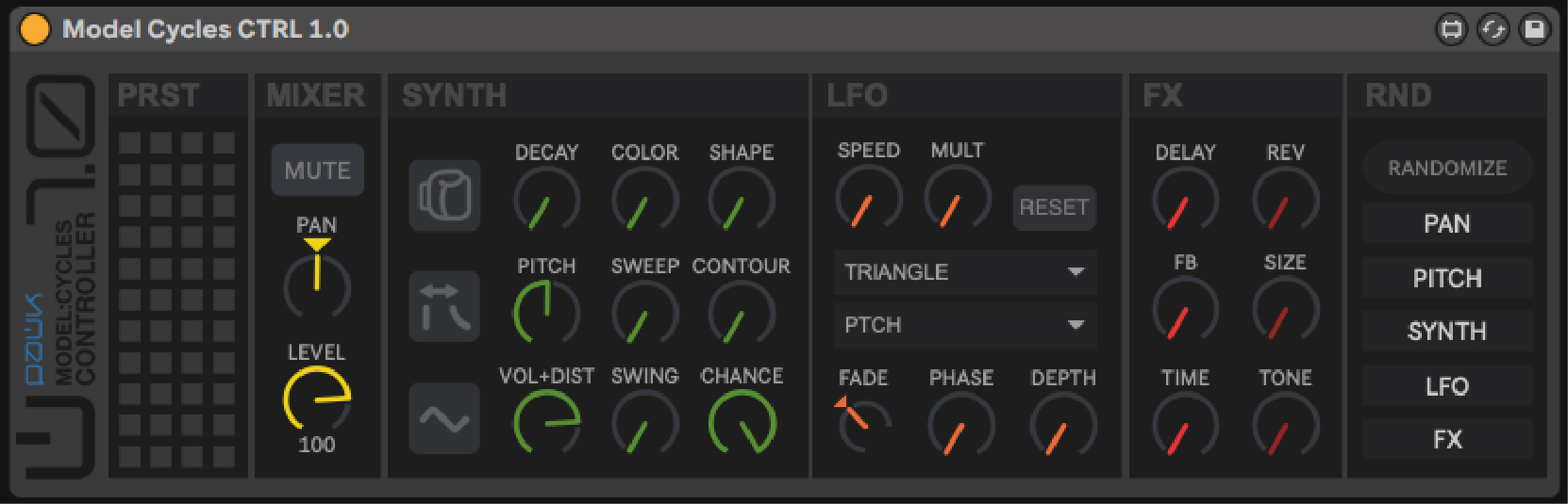 | Description: | Model:Cycles CTRL 1.0 is a midi max for live device to control the Elektron Model:Cycles. The UI is divided in the main sections of the hardware, Mixer, Synth, LFO, and FX. There is a Preset storage section where you can save up to 44 presets within the Live project. And finally there is a Randomize section where you can define where the randomization affect by section. Be sure to put the device in a MIDI channel and configure the MIDI Output to route the desired Model:Cycles voice you want to edit. There are two different GUI designs, one dark and one light. Don't hesitate to contact me if you find any problem or if you have an idea to update the device :) |
