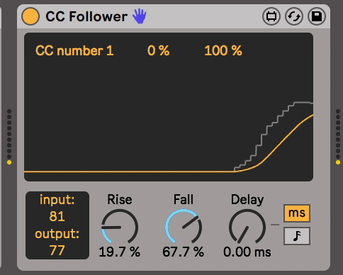 Description: Takes the functionality of the classic m4l Envelope Follower to midi CC passing through the device, allowing you to smooth out and delay the movement of a CC number. Enjoy!