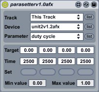| Description: | changes the selected parameter to one of four selected values over a set length of time. value will show up red if out of range for the current parameter. good for altering settings at the end of one tune/start of another. Note: this device writes automation data onto the parameter being controlled. we see this as a good thing. |