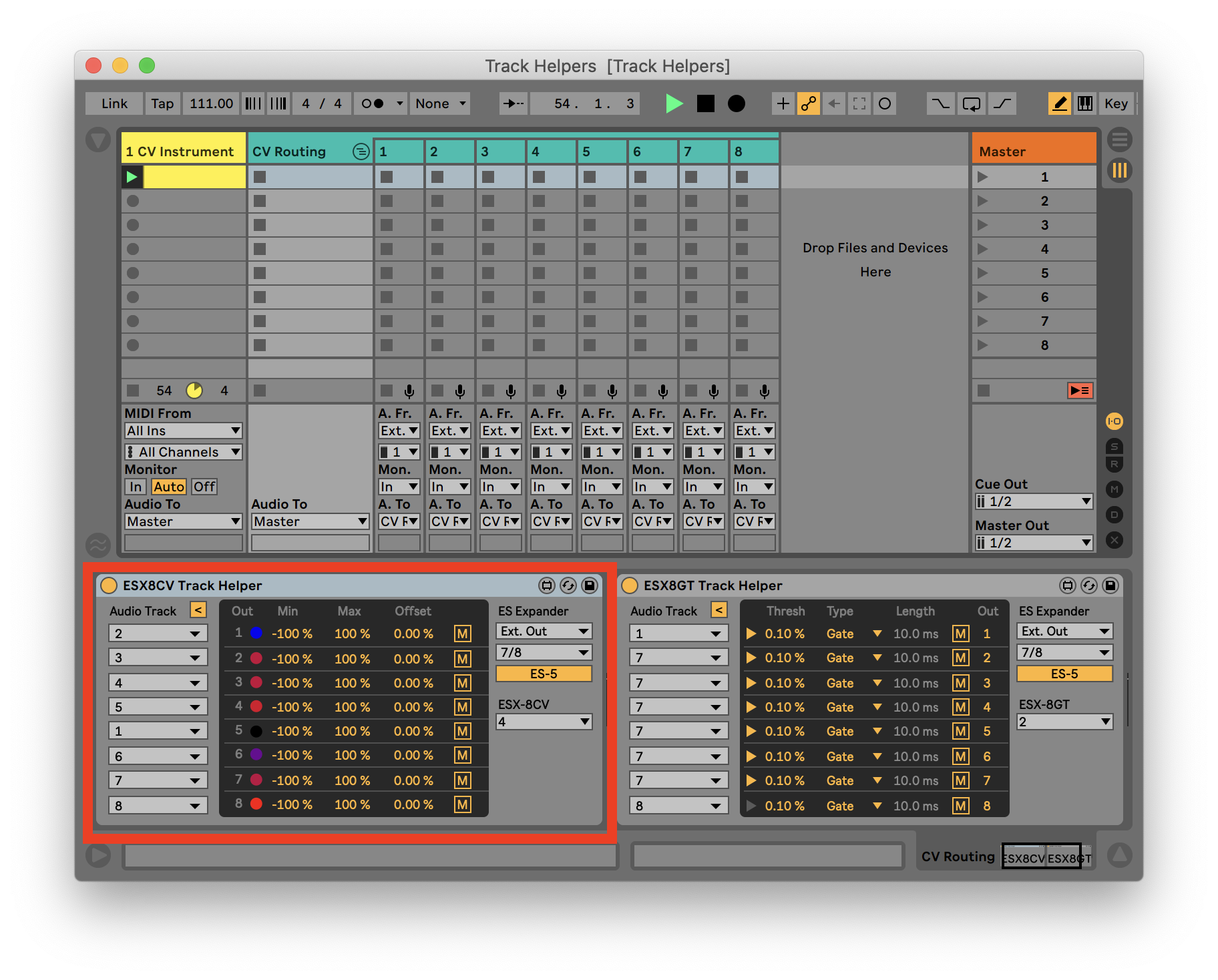 | Description: | Requires Expert Sleepers ES-5 & ESX-8CV expanders. Use this device with standard Ableton CV Tools to send CV out via ESX-8CV. Send output from Ableton CV Tools to Audio Tracks in Live, then use the ESX-8CV Track Helper to encode the signal for your ESX-8CV expander. A little "plumbing" advice: Create a group of 8 audio tracks. Set the new Audio Tracks to NO INPUT, set monitoring ON. Drop the ESX8CV Track Helper on the group's master. Choose your ES-5 stereo pair, then your ESX-8CV header. Choose your 8 audio tracks in the ESX-8CV Track Helper. Now any signal in your audio channels will output to the corresponding jacks! Let me know if you have any troubles and I'll make a step-by-step video. *1.1 updated a bunch-o-stuff including a toggle for the ES4/40-ES5 You'll need to add the es*encoder~ externals to Max for these to work. https://www.expert-sleepers.co.uk/downloads.html On a Mac the location for externals (windows will be similar): Users/Shared/Max 8/Library/ |