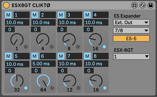 | Description: | ESX8GT CLIKTØ Expert Sleepers ES expanders required. This utility is very loosely inspired by Moffenzeef MITØ and an adaptation of my euclidian sequencer. 8 clock dividers (up to 64 steps). Have fun with mutes, assign LFOs or expression lanes to the clock divisions, nudge the sequence forward or back. gates for days You'll need to add the es*encoder~ externals to Max for these to work. https://www.expert-sleepers.co.uk/downloads.html On a Mac the location for externals (windows will be similar): Users/Shared/Max 8/Library/ If using with an ES8/9 as an aggregate device turn off DRIFT CORRECTION |