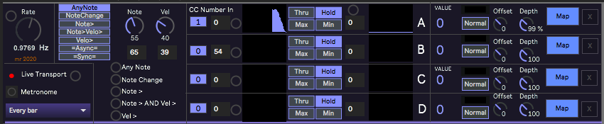 | Description: | This is an experimental MIDI Continuous Controller processor utility. It takes four incoming CCs and processes them, then allows them to be mapped to four 'Voltage Control' targets inside Live. It was inspired by a query from Wael Badrawy in the 'Max For Live Users' Facebook group, who wanted additional control over the quantisation of the MIDI CC messages from his Expressive E Touche SE MIDI Controller device. The 'Hold' function can be triggered by any MIDI Note, by a change of MIDI Note Number, by a MIDI Note Number above a value, by a MIDI Velocity above a value, or by a Note and Velocity that are both above a value. It can also be triggered by an Asynchronous clock or by Live's Transport timing, and these can be gated by the Note. (Future versions may provide better gating functions, and it may be possible to use the CC messages to trigger the 'Hold' function...). The gated synchronous mode ('[NoteSync]') is probably the closest approach so far in this device to a 'Quantise' function. This version uses the same trigger for all four CCs. This could be extended to 'per CC' if there is any interest in this function. This is a rapid prototype and may contain bugs. Use with caution. |