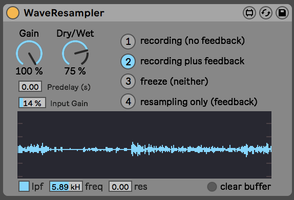 | Description: | This effect samples from a running 15-second buffer, with a number of resampling options which can turn any source into a wall of sound, producing unexpected resonant tones over time. In its first mode it can also be used as an odd-sounding looping delay. The basic premise is inspired by Alvin Lucier. Playing with the Wet/Dry, especially using a percussive or plucky source produces good results. To my ear, the dense resampling resembles granular synthesis or a very dirty reverb. I've included an extremely long pre-delay option with ambient performance in mind. ***MODES*** 1. Recording (no feedback) -This mode creates disjointed echos which reach back in time as far as 15 seconds. 2. Recording plus feedback -This is the same as mode 1, but the output is fed back into the input. Individual transients quickly dissolve into a wall of sound. 3. Freeze -All recording stops, allowing the wave~ players to jump around a static 15 second buffer. 4. Resampling only -This mode blocks off incoming audio while it continues to feed back. Over the course of a few minutes, resonant tones begin to emerge, turning even a percussive sample into a modulating drone with prominent overtones. |