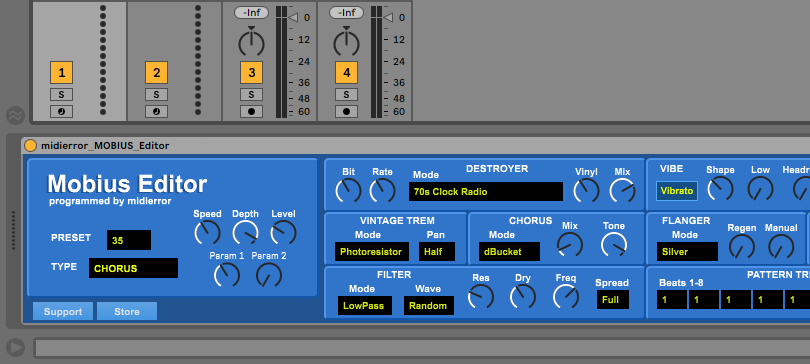 | Description: | A Max4Live editor for the Strymon Mobius pedal - enabling control of all the parameters and storage of their automation within your Ableton Live 10 track. Included in the download are: Install Guide Manual Max4Live AMXD File Control every parameter of the on board effects which include CHORUS, FLANGER, ROTARY, VIBE, PHASER, FILTER, FORMANT, VINTAGE TREM, PATTERN TREM, AUTOSWELL, DESTROYER and QUADRATURE. An additional Sync to Ableton feature has been added to match your track tempo to the effects. Once purchased you can contact me any time using the built in Support button, with questions, ideas and suggestions. If you have any questions about the software, it's functionality or usage please contact me BEFORE purchase, as I do not offer refunds on software downloads. Required Software: Ableton Live 10 with Max4Live Required Hardware: Strymon Mobius Please note: This is not a patch librarian, it will transmit parameter changes to the BigSky but the software does not load and save patches. However, you may save sounds on the BigSky, as described in the manual. This product is in no way affiliated with or endorsed by Strymon. |