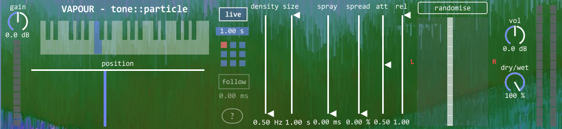 a granular audio effect similar to Clouds by Mutable Instruments. can be used with live input or by dragging in audio samples |
