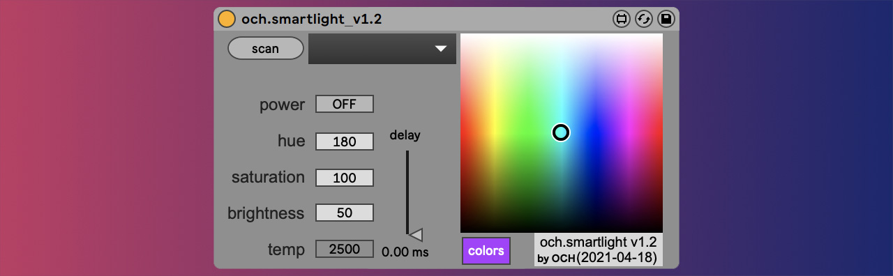| Description: | Control your TP-Link smart lights from Ableton. click "scan" to scan smart lights in your network, then select which one you want to control. Change between white and color modes. Turn it on or off and control hue, saturation, brightness, and temperature independently, or several parameters at the same time on the XY control. Release notes: 1.2 - replace max boxes with live boxes - clarify delay value - allow multiple devices on same live set - add hidden live.menu with placeholder options - several bug fixes, including less undo history 1.1 - sync swatch with sliders - add MW screen 1.0 - initial release https://www.youtube.com/watch?v=yHQ8JZfsFig Note: this has been tested only with TP-Link Kasa KL130 smart bulbs. Thank you for your support. |