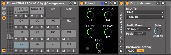 | Description: | I created this Ableton Live Drum Rack because I needed a simple solution to compose, jam and perform live with the Roland TR-8 using Ableton Push. This is the perfect solution to sequence and tweak the drum sounds comfortably. One limitation I encountered down the road: The mute and solo functions of Ableton are Audio centric, that means that midi data is still transmitted during mutes; if your synth or sound source is not routed back to Ableton via audio interface you can still hear the instrument. To solve this problem I integrated Drum Rack MIDI Mute and Solo by regularjack https://maxforlive.com/library/ device/6679/drum-rack-midi-mute-and-solo in the chain, this solution works like a charm. Use case scenario: Bunch of external instruments connected to an analog mixer Ableton as a sequencer only. (that’s mine) Installation: Unzip the downloaded file, open the folder containing the included files. Open your Ableton User Library on a new window, the default path is: Windows: \Users\[username]\Documents\Ableton\User Library Mac: Macintosh HD/Users/[username]/Music/Ableton/User Library Drag and drop Roland TR-8 RACK v1.0 by @frankgroove.adg into /Presets/Instruments/Drum Rack/ Drag and drop the Max MIDI Effect folder into /Presets/MIDI Effects/ *** You can also copy the individual files as you see fit or even on your preferred folder structure if you know how to solve file dependency issues inside Ableton. Usage: You will find the drum rack on your user library - presets - instruments - drum rack inside Ableton, just drag it to a new midi track. Routing: Highlight a pad on the drum rack, change the corresponding midi device, channel and audio return, you must repeat the steps for every pad. Once you finished the routing process you can click on the save preset button, that way you can recall this exact setup from the user library every time. Contact: francisco@franciscofoto.co instagram: @frankgroove |