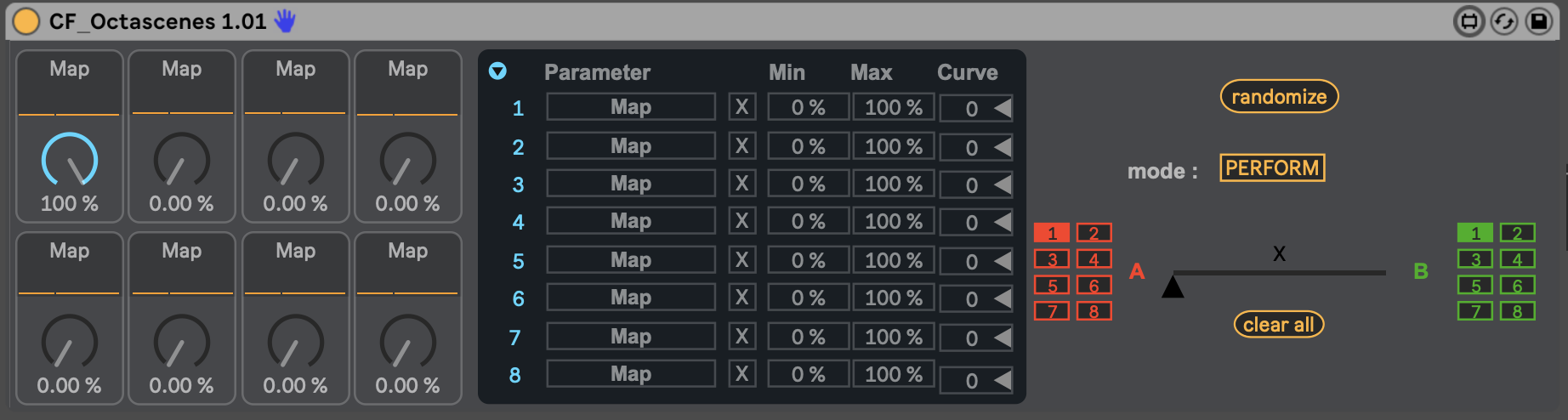 | Description: | Inspired by Elektron Octatrack's "scenes" feature. Map up to 8 parameters. Store up to 8 snapshots. Crossfade between two snapshots. Support me by buying/listening my music : www.chapelierfou.bandcamp.com |