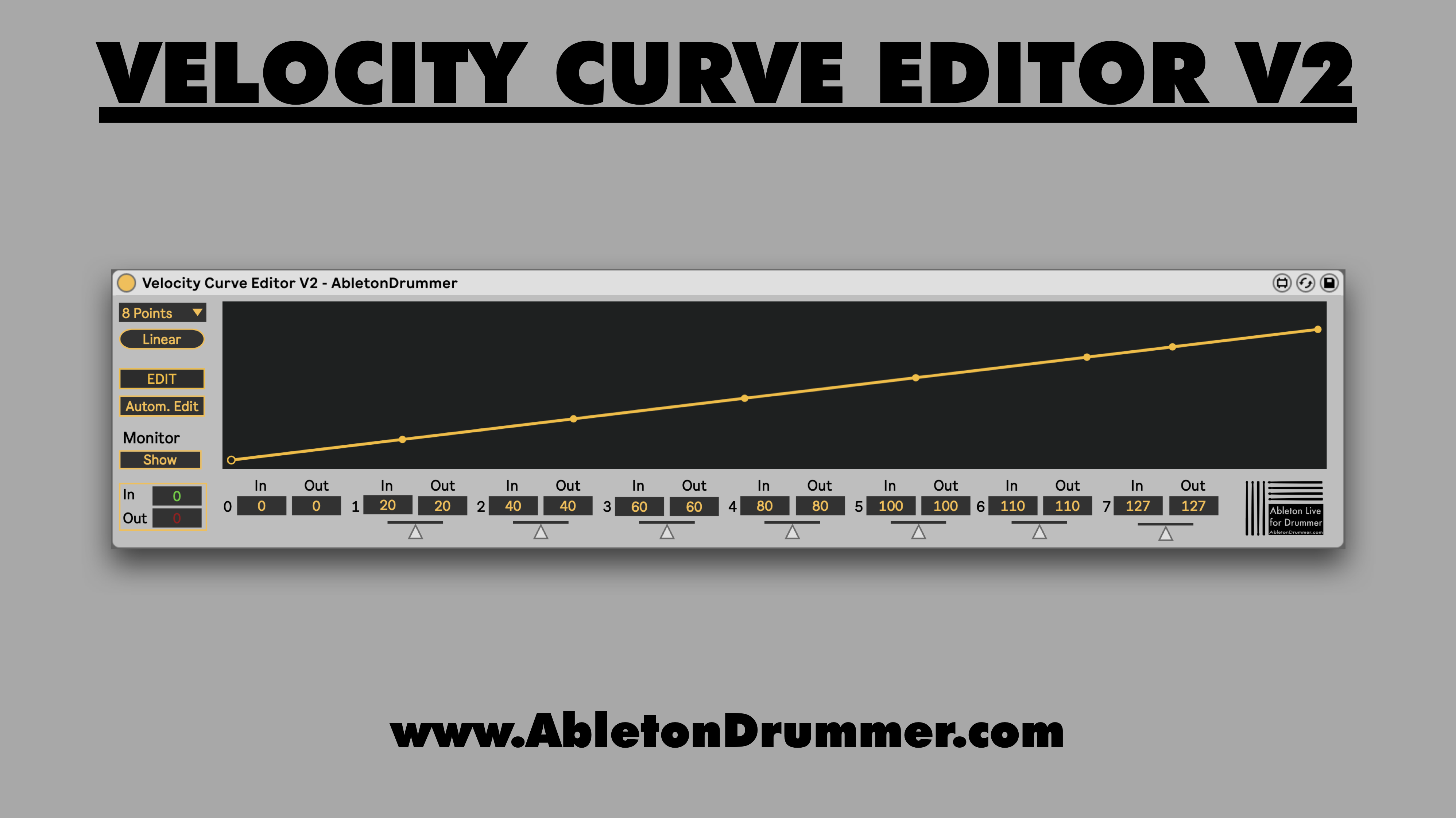 The Velocity Curve Editor lets you change the velocity of incoming MIDI notes. Especially when using external MIDI controllers, electronic drums / drum pads you sometimes don’t get an ideal range of velocity values. Depending on the sounds and samples you are triggering, you sometimes want some more in depth control and some more flexibility in changing the velocity values for a perfect sound/sample triggering behaviour. |