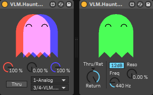 | Description: | A pair of cute devices for multimode filter send/return sidechaining, based on Tiptop Audio's Forbidden Planet. VLM.HauntedHouse.Send splits the signal and sends it to a VLM.HauntedHouse.Return's 3 inputs: a lowpass, a bandpass and a highpass filter which all share the same cutoff and resonance settings. Note: This is a quirky filter toy. It has its uses, but it is definitely not multiband splitter. There are better devices for that. Analog Sallen-Key filter emulation by Surreal Machines. |