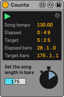 | Description: | Counta is an API based countdown clock. Just set the desired length of the track / jam session, hit the record button, record your improvisation, Counta will stop the session at the right time. https://www.youtube.com/watch?v=MWkOQZrtuxM Version history: v1.oo - initial release v2.o1 - UI glitch fixed, device now follows correctly the selected Live theme v2.o2 - Apple silicon check v2.o3 - dynamic UI v2.o4 - Live 12 compatibility check |