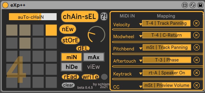 | Description: | Hello This device allows you to have differents settings for your expressions. It's an expression mapper and preseter. The core of the device is based on Expression Control + by SimonR you can find his device here : https://maxforlive.com/library/device/5695/expression-control-plus which is based on the m4l stock device Expression Control. In additon, the auto switch and preset manager of the device mAp++ are added. Usually with devices that handle mappings settings, the parameter which is mapped becomes greyed and you can do nothing with it except moving it with your controller or another device, and, above all, even when the device controlling the parameter is switched off, the parameter is not released/unleached... ...not here. With eXp++, all the binded parameters are released when the device is off. And, above all, everything is re-binded when it's switched on again ! The more interesting is that it is the same for each preset of the device. =) In preset one, you can have a mapped parameter, and having it too in the preset 2 but with differents settings. You can on the fly change all the mapping settings of your expresion controller and automate these changes very quickly. You can automate the way that the changes change =) Hope it will be helpful ! Cheers Julien ..............................It's a BETA release. Please tell be about bugs and suggestions !............. ............v 0.4.7. - really fixe a bug with 'clear', 'store' and "new" which made blink all map button when they were pressed the 1st time. - Chain Mode compatibility with Live 11. The device observe the Live version at startup and change behaviour accordingly. -->this same version should works either on Live 10 and 11. ............v 0.4.6 - bug fixe. map button was not properly reinitialized. they blinked when clear button was pressed. ............v 0.4.5 Feat: - 6 tracks to express Live with your controller - For each track a parameter can be controlled by : - velocity - modwheel - pitchbend - aftertouch - keytrack - note - control change - For more informations about the settings, visit the SimonR's Expression controller page. - these settings can me recalled by : - the SELECTED TRACK. Changing the track selection change the device preset - the SELECTED SCENE, Each selected scene triggers a eXp++ preset. - the SELF MODE. default. Play with presets and the "auTo-chAin" slider. - the CHAIN SELECTOR of a rack, if the device is in a rack. . In this mode you have to put one device per chain. - The track of the controlled parameter is seen in the map button! Very often with this kind of device, only the name of the parameter is written in the Map Button. But "Track Volume" is not very understandable when you have 24 tracks... Here, each button shows the track where the controlled parameter is (Usual Track / Return tracks/ Master Track) - The output visualistion is embeded in each Map Button. - Multimap - An auTo-mAp slider can be assigned with what you want to switch from one preset to another. If you have 4 presets this slider will have 4 positions, if you have 10, it will have 10 positions. It's very useful when you assign it to an hardware knob or slider, the stroke of the knob is always fully used. In addition to that. All the stroke is used even if your presets are not adjacents. Mapping this slider with (for example, an LFO) allows you to sequence your expression settings =) - A big dial allows to control the 6 tracks of eXp+ in the same time. It's mappable too. When it's automatized or mapped, the 6 others ones can still be used, the informations are both sent. ----------> I test this functionality in this release, not sure it's really useful.... - 20 presets in the same time per device - New / Store / Del / Clear buttons for touchscreens. - read / write to store/recall presets file configuration (.json or .xml) - 3 views : Minimum / Maximum / Hide ----------------------------------------------SETUP A)- click "New" or "Store" an empty preset slot - choose an expression parameter in the list - click on the corresponding "Map" buttons. It will blink. - click a mappable parameter in your live set. - click the "Max" view, tweak others paramaters if you need - do the same with others tracks of eXp++ - click "StOre" or shift+click on the preset slot you choosen. B) -repeat step A with another preset slots C) -You can save this setting with the Write button - the id of mappable parameters change from one live.set to another so, name your file with the name of the live.set you used when you created it, to avoid issues. ------------------------------------------------------------------- You can download another device which do the same but about bindings here : https://maxforlive.com/library/device/6922/map-plus-plus |