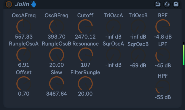 | Description: | This is a chaotic noise device inspired by Rob Hordijk's Benjolin. It creates aleatoric patterns by using two oscillators to control an emulation of a shift register. https://cycling74.com/forums/sharingemulation-analog-shift-register if you like this plugin, please donate: https://www.paypal.com/donate?hosted_button_id=GRN7X2DQQQVCW |