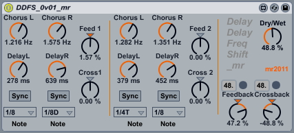 This is an improved version of the Delay Delay effect, but with added frequency shift chorussing (which kind of makes the echoes sound more 'organic' in character), plus a minor change to the sync - you can now edit the timing so it isn't beat perfect, which can be very cool!