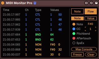| Description: | The native MIDI Monitor device with some added features : Note vs Value : In Flow mode, display note messages either as note names or numbers Max Console : Open the Max console for being able to see a higher number of events Note filter : Monitor only the selected note CC Filter : Monitor only the selected CC Fixes : Fixed the white screen bug when device was loaded in Flow mode |