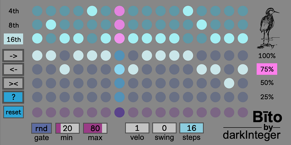 | Description: | Bīto is a creative sequencer by darkInteger. It has a lot of options for your twisted sequences. Features: -set probability per step -set beat division per step -set gate lenght per step -random gate lenght -sequencer play direction demo: https://youtu.be/ANsNHBoFuSg |