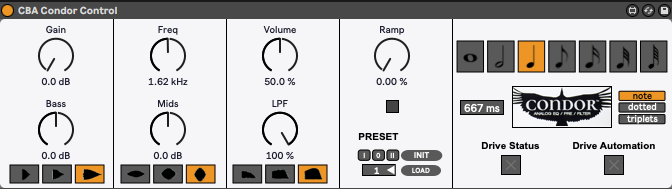 | Description: | A midi device for controlling the Condor pedal via control changes. I tried to make a match as close as possible for the knob that selects the cutoff frequency for the mids. The manual states that it varies between "150 Hz, Noon is around 1250Hz, and all the way clockwise is a little over 4kHz". Taking measurements with Smaart, I found rather that it started from 115 Hz to go up to about 5200 Hz :-) Unfortunately the pedal doesn't accept any midi clock; there is no command that allows a tap tempo or anything that can reset the ramp time. The only thing that came to my mind to create a time-based effect for Live was messing around with the CC # 103, a.k.a. the "bypass switch" control. An automation allows to switch between the on/off status of the drive parameter. And this alternation is done according to the bpm of the Live session; you just need to specify what kind of note divisions you want. You can also choose the triplets or dotted variant. The final effect is a kind of (harmonic) tremolo, which can get really crazy when run at dizzying speeds, like with a sixty-fourth note division. |