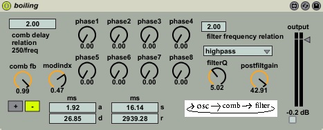 Description: a monophonic synth consisting of 8 parallel oscillators (1. to 8. harmonic of the note frequency) that feeds a comb filter which is fed into a biquad-filter. The output from the biquad-filter is clipped and used to modulate the frequency for the oscillators.