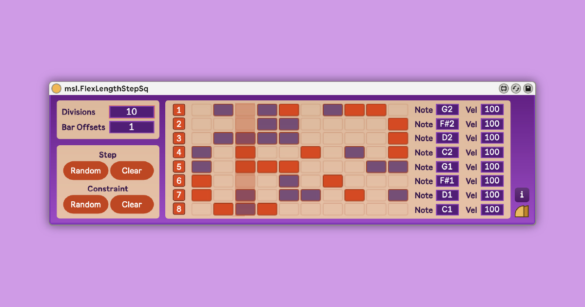| Description: | ---About--- Step sequencer with a variable number of steps and loop length to create flexible polyrhythms. For example, if Ableton Live is set to a 4/4 time signature and "Bar Offsets" is set to 1, then a loop of 5 quarter-note beats can be divided into the number of divisions specified in "Divisions". ---Sample Video--- https://youtu.be/5v_nkCpe6Yk ---How to use--- [General] Divisions ... You can change the number of grids in the sequencer. Bar Offsets ... You can add a number between 0 and 4 to the number of beats in the time signature set in Live. For example, if the time signature is 4/4 and set Offsets to 1, the total length of the grid will be 5 quarter-note beats. [Step] Random ... With each click, the step sequencer cell is randomly selected. Each time you press the button, the selected cell will be increased. Clear ... Set all cells to clear. [Constraint] Random ... Randomly enable/disable the cell of the step sequencer. Clear ... Set all cells back to selectable. [Grid] Grid ...When selected, the cell will turn red and the MIDI specified by "Note" and "Vel" in that row will be output. The length will be the length of one beat, calculated by the number of "Divisions". Note ... Specifies the MIDI pitch. Vel ... Specifies the MIDI velocity. ---Where to get--- For more information, access to https://masalaaudio.com/all/max-for-live/expander/flexlengthstepsq.html This device is also included in our Allspice Set Vol.1. https://masalaaudio.com/products.html |