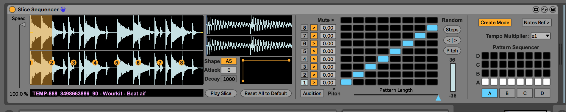 | Description: | ‘Slice Sequencer is a Max Instrument for re-sequencing audio samples, designed to inspire creativity quickly and easily through intuitive controls. Samples are split into 8 slices, with multiple randomisation options and control over various parameters of each slice. Multiple patterns can be sequenced in turn, with changeable pattern lengths allowing polyrhythms to be tested with ease – Slice Sequencer can spice up stale rhythmic loops in the blink of an eye.’ This is 1 of 4 devices I've made as a uni project, and am now looking for feedback on. All 4 are made to be super quick to use - check the Quick Start section in the manual to get them up and running ASAP. I'm entirely self-taught so any comments are appreciated! --- v1.1: - Bug fixed where multiple instances of Slice Sequencer in the same project all loaded the same audio file. - Pattern lengths are now automatable. |