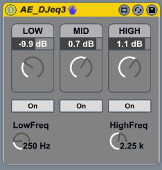 | Description: | AE_DJeq3 is a simple 3 Band EQ with kill buttons. The device bases on 'Max EqShelving'. Now it has a centered 0dB position and a range from -28dB to +5.6dB. I use the EQ with my faderfox dj2 midi-controler. This is my very first max for live device...so feel free to give feedback and report problems. |