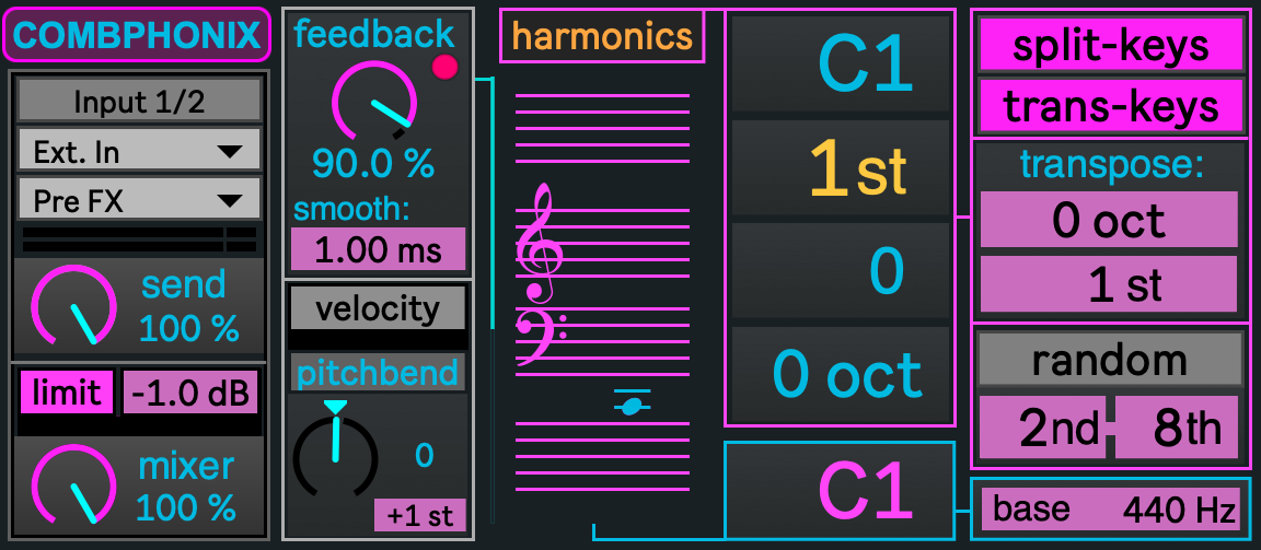 | Description: | COMBPHONIX is a fancy comb filter instrument. Although this is a MIDI-Instrument, it does not produce any sound by itself. It is rather an audio effect, that is playable via MIDI (-Keyboard) and therefore needs an external sound source. This means you have to select a another track in the input section of this device (top left) and have that other track make some sound! 3 different main modes: monophonic, polyphonic, harmonic In polyphonic mode a maximum of 4 simultaneous notes can be played. (using steal mode of max's poly) In harmonic mode it is possible to play harmonics when pressing two or more keys. The highest key will specify the harmonic on the basis of the lowest key. The chosen harmonic will be closest to this key regardlessly of its actual register. Each octave is so to say divided in steps from 16th to 32nd harmonic. To be able to play all of these harmonics on a usual keyboard two keys have to be pressed surrounding the 11th, 13th, 29th and 31st harmonics. (see: "split-notes_key-combo") It is of course possible to play even higher harmonics, but with gaps in the scale. Using the transposing key combos harmonics up to the 32nd can be played in a small range of 2 octaves (see: "transpose_key-combo") The random option plays random harmonics in a specified range on the lowest key pressed, changing with each note change. ------------------------------------------------ To get more info about any parameter activat the "Info View" in Ableton Live and hover over it. For any further questions you can comment here or find my contact data on my website. ------------------------------------------------ This device was realised as part of the "Stipendium des Ministeriums für Kultur und Wissenschaft des Landes Nordrhein-Westfalen für Künstlerinnen und Künstler zum Ausgleich von Nachteilen im Zusammenhang mit dem Ausbruch von Covid-19 im Jahr 2020" |
