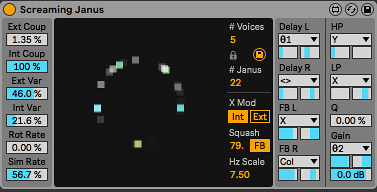 | Description: | FREE FREE DEVICE! It has 2 main components: a simulation of Janus Bunch Oscillators and a corresponding bank of brutal oscillators. I will describe both below. PROMO: https://www.youtube.com/watch?v=7PSzlC-Q03U WALKTHROUGH: https://youtu.be/n356mKtxnbo JANUS BUNCH OSCILLATORS: To best understand what these are I recommend going to this interactive webpage, which is where I was inspired and grabbed the model from: https://www.complexity-explorables.org/explorables/janus-bunch/ I will briefly explain (skipping over details) in case you don't want to read. A Janus Bunch oscillator state is made of two phases. The model can describe synchronization (between the internal phases as well as external oscillators) by coupling both internally and externally. This allows for very interesting and complex movements of the phases. Additionally for this implementation, the oscillators are given XY positions determined by the two phases and a rotational speed. Their colors and Z positions are also determined based on the deltas of the phases. So all in all we get from each Janus Bunch oscillator voice: 2 running phases, an XYZ position, and a color value. These are visualized in the center of the device by squares. NOTE: The Janus Bunch oscillators in this device DO NOT CREATE SOUND themselves, but the positions, phases, and colors are used to drive and modulate sound in the brutal oscillators described below. THE BRUTAL OSCILLATORS: This is what we hear in the device. Each brutal oscillator voice corresponds with an associated Janus Bunch oscillator. Here is roughly the signal path of each brutal oscillator voice: - The original signal comes from the 2 running phases of the associated Janus Bunch oscillator. These are sent through a cosine function to create a stepped sine wave (which is more aliased and has more harmonics). Both of the resulting sine waves are panned hard left and right. - Next, the signal is cross-modulated (optionally) by the previous frame's sum of all of the brutal oscillators. - Next, the signal is cross-modulated (optionally) by the previous frame output of the voice - Next is a highpass and then lowpass filter - Next is a stereo delay line with different times for the left and right signals respectively - Next is a brutal wave-shaping of the signal - Next is the feedback for the delay, which has an option for being with the wave-shaped signal or the signal right after the delays - Ends with a tanh function and gain reduction There are parameters on the device for applying modulation to the following parameters: Delay time Left and Right, Feedback amount Left and Right, Highpass and Lowpass filter cutoffs, Gain. The modulation sources include the Janus Bunch oscillator positions, colors, and phases as well as a static spread between each voice. VERSION INFO: Works with Live 10 and up! TO INSTALL AND USE PRESETS: Drop the entire folder called "Screaming Janus" (NOT the folder called "Screaming Janus v.x.x.x") into the folder called "ableton/user library/presets/instruments/max instrument". This is found in the "Places" section in Live's browser or in your finder/file browser. If you are going through finder (mac) the Ableton folder is typically in your "Music" folder. If you are going through your file browser (windows) it is typically in the "My Music" folder. IF THERE ARE ISSUES: Make sure you have the latest version of Live 10 or Live 11. If that doesn't resolve things then download the latest version of Max/MSP from cycling74.com (you don't need a license to download it), then in Live's preferences, set max to that version and reset Live (if you have an old crack of Live then you will have to add a line in the options.txt text to make that work, google for more info). If you still have issues after that then reach out to me (email is below). MORE STUFF: dillonbastan.com CONTACT ME: dillonbastan@gmail.com |