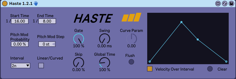 | Description: | Repeat MIDI notes at a rate that accelerates (or decelerates) between two note values over a time interval. USAGE: 1. Set Start Time and End Time. These values are divisions of a measure (not necessarily the Interval chosen). Note that you can choose any decimal number in the denominator for each of these values and you are not restricted to the typical 1/4, 1/8 plus dotted/triplet values (or alternatively milliseconds) that you are accustomed to. 2. Set Interval. This is the time interval over which we will accelerate between Start and End times. 3. Turn On/Off Linear/Curved. This determines whether the device will generate notes based on a linear or curved line. 4. Optionally set Curve Param. If Linear/Curved is set to ON, this determines the shape of the curve. Positive values generate notes based on a logarithmic line shape while negative values generate based on an exponential line shape. If this is parameter is set to 0, it will work identically to having Linear/Curved set to OFF. Note that this parameter is disabled while Linear/Curved is set to OFF. 5. Optionally set Gate. This will shorten the notes output by a factor of 0-100%. 6. Optionally set Pitch Mod Step and Pitch Mod. This will pitch shift the notes output by the value set by Pitch Mod Step based on the probability set by Pitch Mod. For example, values of +1st and 33% gives you a 33% chance that each note generated will be shifted up 1 semitone. 7. Optionally set Swing. This will swing the notes output by this value in milliseconds. 8. Optionally set Skip. This determines the probability of skipping any given note being generated by the device 9. Create a clip and add some MIDI notes (preferably as long as your Interval). Notes will be output for as long as the input MIDI note is held and will end on note-off or when transport stops. 10. If you want to run the current pattern at double or half of the current Interval (or any other % value), set the Global Time to 200% (twice as fast) or 50% (half as fast). Keep in mind you might need to update your MIDI pattern to accommodate the time changes you make with this setting - i.e. half or double the length of the MIDI note. SUGGESTED USE: * This was originally designed to generate unique rhythmic patterns, so use with a Drum Rack is recommended but not required. Any MIDI instrument will work. * Place a Haste instance before a Drum Rack and offset input notes for each drum sound to generate unique rhythms. * Alternatively, place an instance of Haste on individual drums and customize the settings for each voice to generate even stranger rhythms. * You can choose the same value for Start and End and simply use it as a repeater for unique note lengths like 1/6.66 or 1/4.20 DEMO VIDEO: https://www.youtube.com/watch?v=bbsfvU1P7w0 CHANGELOG 1.2.1: * UI revamp * Added velocity line function. Draw a line and Haste will map the values to the velocities of the notes output over the selected interval. Or switch it off and Haste will output a fixed velocity based on the input note. 1.2.0: * Added Linear/Curved, Curve Param, and Skip settings. See descriptions above. * Changed parameter labels: "Pitch Mod" is now "Pitch Mod Step" and "Mod Prob" is now "Pitch Mod" * Changed Pitch Mod step values. Now allows for negative step values. Total range is -12st to 12st. * UI / layout update to accommodate new settings NOTE: If you like the device and find it useful, consider tossing me a few bucks via the Gumroad link below. Included there is a bonus rack for Live 11 users that has some great snapshot presets to get you going. |