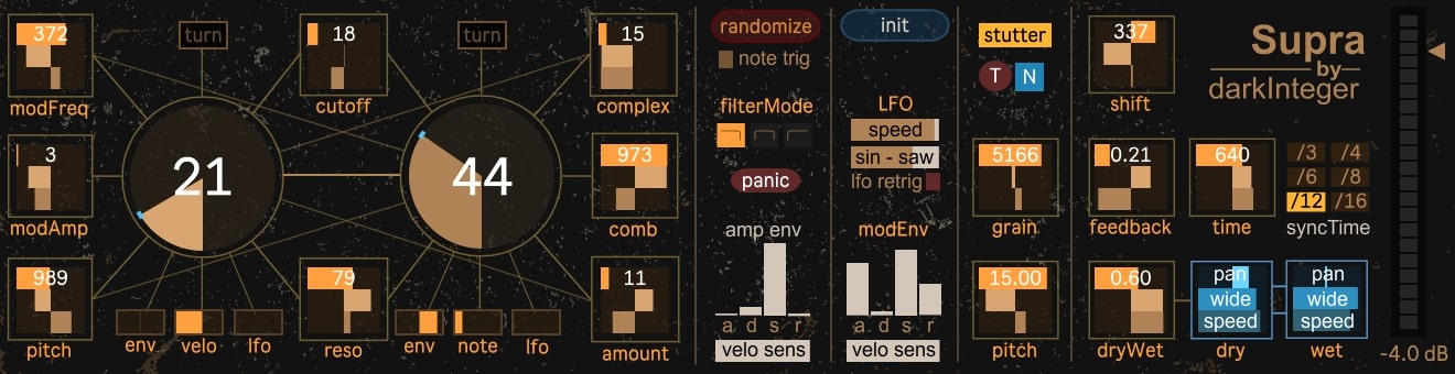 | Description: | Features: -fm engine with sine carrier and hyperbolic sine modulator -Steiner-Parker multimode filter -additional comb filter -stutter engine -modulation lfo -modulation envelope -delay with frequency shifter -2 big knobs for altering the sound with modulations -unique modulation system -you can play the synth with the 2 knobs as you turn them -autopanner for dry and wet signal -customizable randomizer engine for quick sound creation demo video: https://youtu.be/kvr1YWXYnsE |