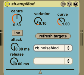 | Description: | zb.ampMod uses Hilbert transform based instantaneous amplitude estimation for modulation. The attack and release controls smooth this staircase function. The output range can be adjusted in extent using the variation parameter in absolute deviation using the centre and in curvature using the curve controls. The output box and slider serve display purposes. The inv toggle inverts the output control signal. |