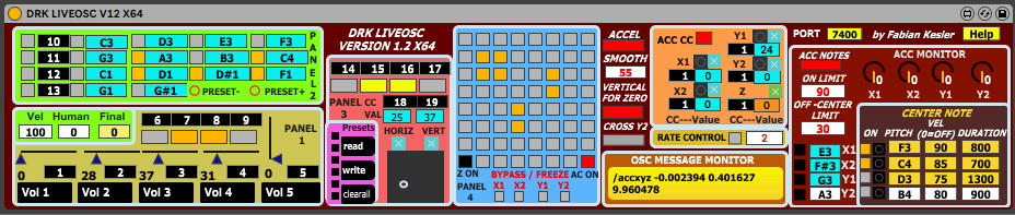 | Description: | DRK LIVEOSC IS AN OPEN INTERFACE FOR YOUR CELL PHONE-TABLET VIA WIRELESS-WIFI (INTERNAL NET, NO INTERNET NEEDED) OSC WICH TRANSFORM TOUCHES AND MOVEMENT (DIVIDED IN 4 MOVEMENTS WITH FREEZE OPTION) TO MIDI CC AND NOW TO MIDI NOTES TOO WITH LOT OF CUSTOM SETTINGS TO GET A DEEP AND FLEXABLE GENERATOR-INSTRUMENT WITH LOT OF NEW PERFORMANCE POSSIBILITIES. THIS IS THE 10TH ANNIVERSARY EDITION. IT USES TOUCH OSC APP BUT IT IS POSSIBLE TO REPLACE IT WITH ANY OSC APP WITH THE SAME TEXT MESSAGES. THE .RAR FILE CONTAINS 32 AND 64 BITS VERSIONS, THE STAND ALONE VERSION, A MANUAL AND LOT OF LIVE EXAMPLES IN 32 AND 64 BITS. VIDEO OF NEW FEATURES: https://youtu.be/OFVXaUC6Lu0 VIDEO OF VERSION 1 WITH FULL GENERAL EXPLANATION: http://youtu.be/1NXTHrwaRts VIDEO OF THE CONTEMPORARY DANCE WHERE I USED DRK LIVEOSC V12. EXPERIMENTS AND LIVE SHOWS https://youtu.be/RTYaRBYfVp8 https://youtu.be/z24kpTAjLKg Added Features - Updated V1.2 all versions - Conversion of movement to MIDI notes, both to the sides as well as the possibility of using the return to the center as a generator, with four notes with individual switch and with personalized start-end thresholds. - SMOOTH smoothing or transition between values generated by the accelerometer to avoid sudden jumps. - Global accelerometer switch and proprietary switches for conversion to continuous MIDI control (CC) and for the new feature: MIDI notes. - VERTICAL FOR ZERO Ideal for dancers-performers-actors by maintaining zero or neutral with the phone-tablet in a standing-up position, which is added to the standard use with the cell phone looking up. - CROSS Y2: When used in an upright position, it allows the middle zone to generate continuous decreasing control when entering another zone (crossfade, that is, its value decreases as another rises). If left off, the medium generates values even when entering other zones, in pedal or constant mode. - ACC MONITOR To visualize-test the action of the accelerometers and their conversion to MIDI. Added-Updated Features V1.2 M4L (Max For Live) - 32 and 64 bit independent versions - Versions are FREEZE, which auto-contain the necessary external MAX objects (Windows). The necessary objects for MAC are delivered in a folder if necessary. - The PRESET 1 is no longer auto-loaded so your last settings simply save with the Live project. You can still activate and save internal presets as before with the buttons. Added-Updated Features V1.2 Standalone - Re-designed interface with improved organization of features. - The internal synthesizer and MIDI output work with the new ACC NOTE feature, converting motion to notes. - SUSTAIN PEDAL function, with shortcuts for piano pedal emulator (letter “s”) or constant (letter “a”). - Accelerometer emulator for testing without the need to connect a phone. FABIAN KESLER fvkesler@gmail.com https://fabiankesler.blogspot.com/ |