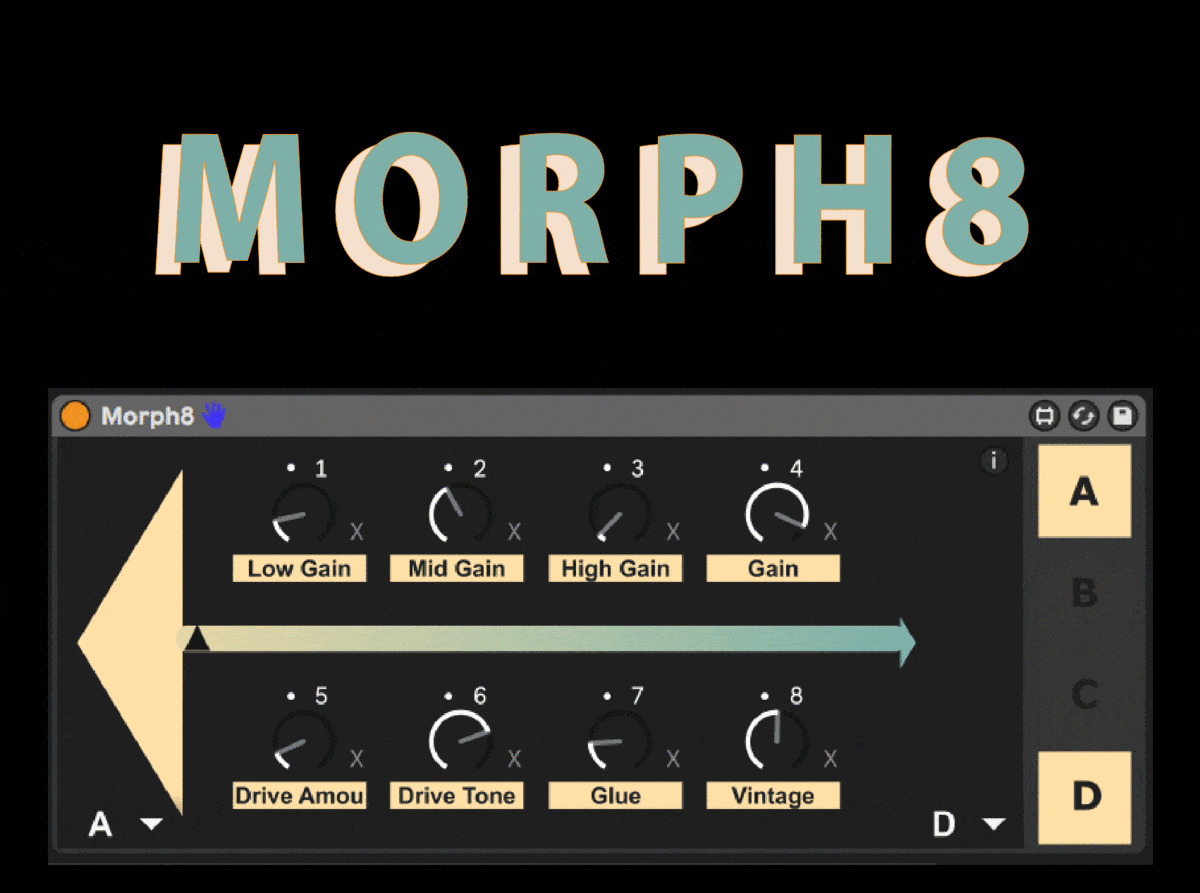 | Description: | Seamless morphing between four sets of 8 mappable parameters in Ableton! Great for sound design. How to use : - Map wanted parameters to one of the 8 inputs. - Shift-click on A, B, C or D boxes to set extremums. - Select left and right target (for example A to D) - Automate, experiment, have fun! |