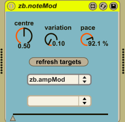 | Description: | zb.noteMod generates a random walk control signal based triggered by note on events. The pace parameter controls the step size. The centre parameter sets the control signal offset. The variation parameter affects the range of the control signal. This plugin is very useful to create variation for each note. |