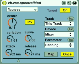 | Description: | zb.zsa.spectralMod looks at a variety spectral properties of incoming signals and based on them creates a control signal. The output range can be adjusted in extent using the variation parameter in absolute deviation using the centre and in curvature using the curve controls. The inv toggle inverts the output control signal. The attack and release parameters control the onset and decay of the incoming signal. The white drop-down menu selects the spectral property for the device to analyse. |