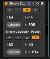 | Description: | A very very very simple calculator that can add, subtract, multiply, and divide. the 'calculate' button is a bit bugged because some operations need a bang to function properly (I'm new to max so most of this is completely foreign to me). Made this one in like an hour. I've included two different calculators in this one device. I can certainly up that to four operators, and possibly even have them interact? Idk, we'll see. If you would like to contact me, here's my discord: https://discord.com/users/305490352880484353 DMs are always open! 1.1 Patch Notes: fixed the multiplication and division sections to actually work |