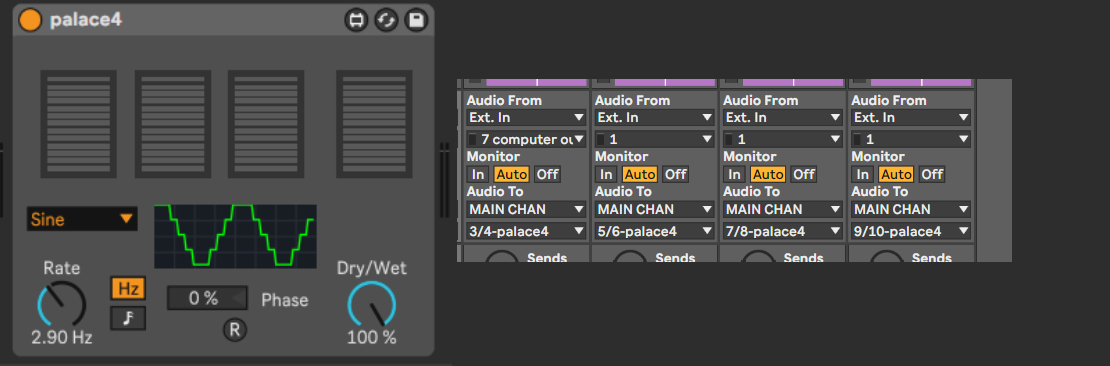 | Description: | 4 stereo channel automated crossfader. Inspired by Dave Young's Crystal Palace (used by Brian Hodgson and Delia Derbyshire for Doctor Who soundtrack). This needs to be on its own channel, and receive audio from separate tracks (see picture). |