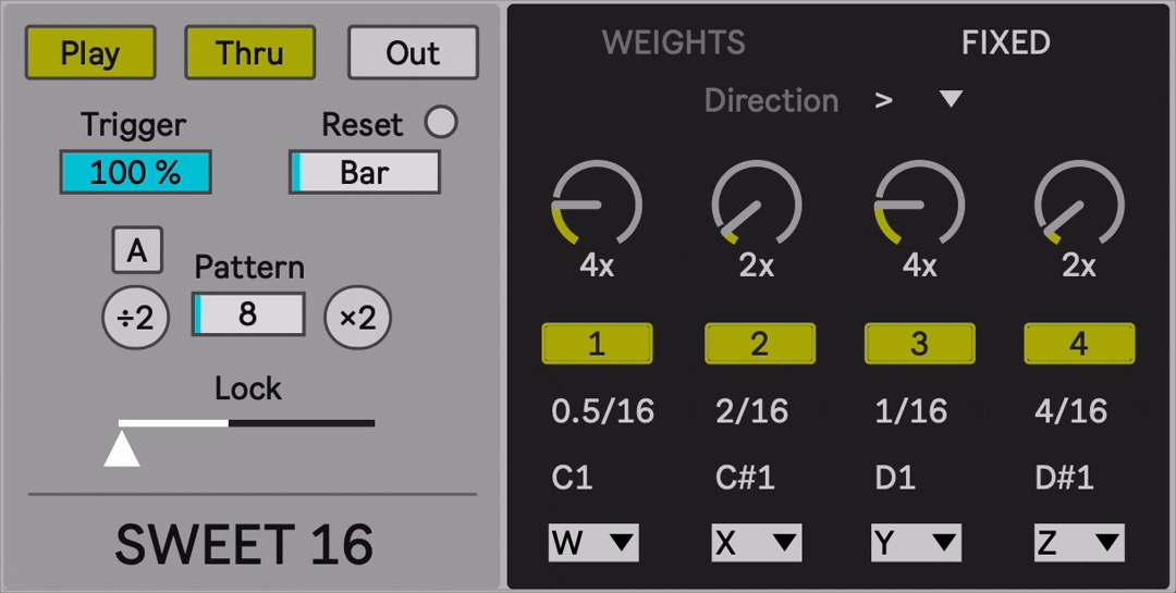 | Description: | Sweet 16 is part of the SEEDS collection. An experimental clock generator that uses four weights to determine the rate of an output pulse measured in 16th notes. Features a pattern soft lock and fixed mode for more predictable rhythmic phrases. Tutorials and more info here: https://www.novelmusic.org/m4l/seeds |