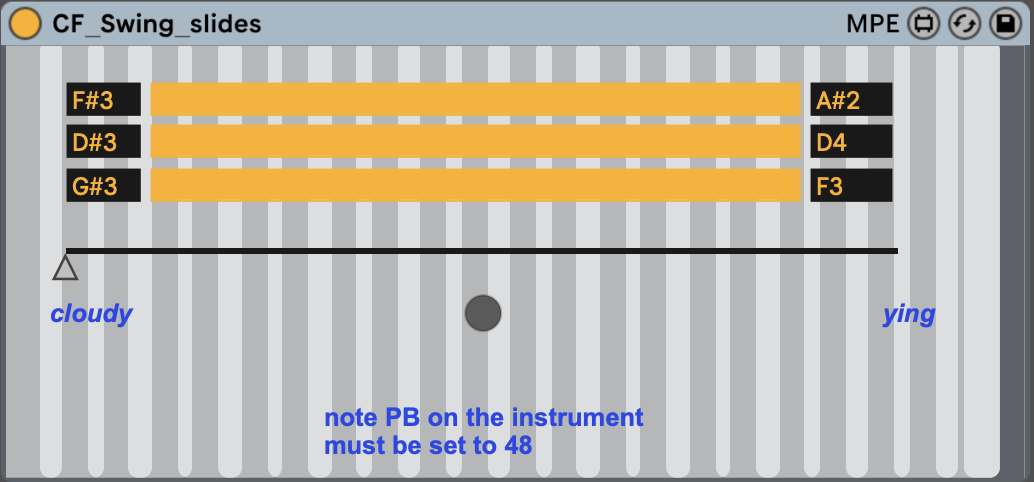 | Description: | This is an MPE MIDI device that slides between two sets of 3 notes. Crossfade between two chords, with every pitch combination in between. You must set the Note Pitch Bend of the instrument to 48 otherwise it will be out of tune. |