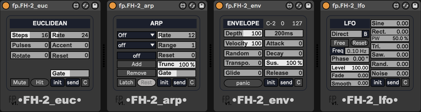 | Description: | FH-2 hardware control: direct envelope lfo Bonus (not developed anymore): euclidean + fp.EuclideanSequencer arpeggiator Hitting toggle "C" for CC (and Note) config. By default set on the FH-2_7expanders.syx file. Tested up to OSX Ventura / Apple silicon ok. It should work on Windows too. |