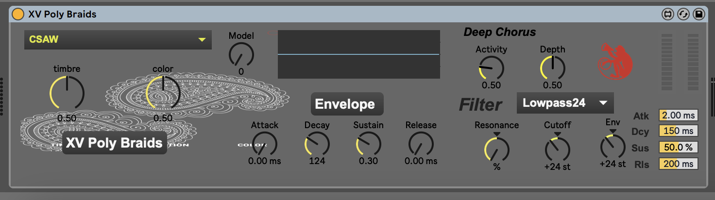 | Description: | Max4Live Virtual Braids with Six voices of polyphony. Plus a Ladder filter and a Deep Chorus. https://youtu.be/x7oA9AzvUaQ Only for Mac OS operative system. Braids originally from Emily Guillet at https://mutable-instruments.net Code adapted for Max externals by Volker Böhm at https://vboehm.net Ladder filter developed by Peter McCulloch. https://cycling74.com/author/5462e932bdbb99652da7a78d Deep Chorus by www.amazingnoises.com XV PolyBraids developed by Paulo Cominotti at https://monotale.com.ar |