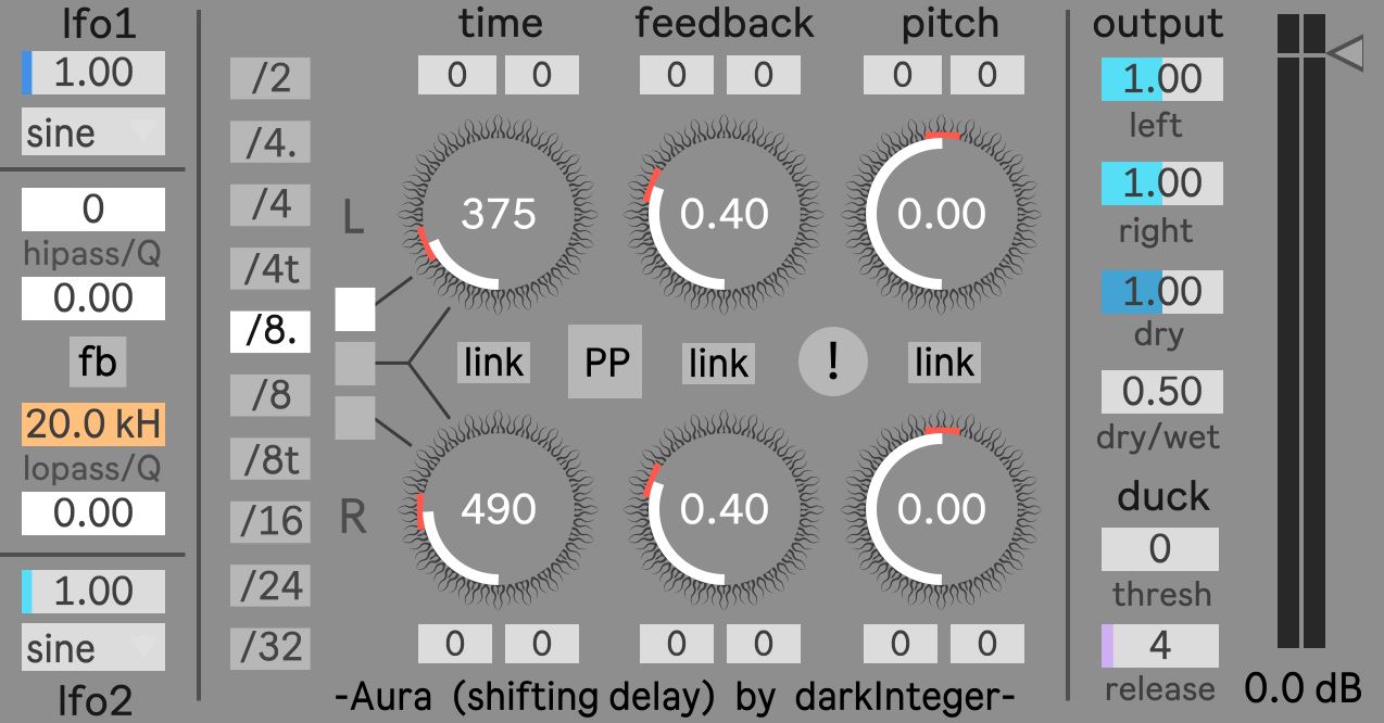 | Description: | Aura (shifting delay) by darkInteger is a Max for Live effect device Features: - frequency shifter in the feedback line - lowpass filter and highpass filter (can be switched into the feedback line) - beat division can be set for the time parameter - pingpong mode - two LFOs for modulating the parameters - STOP knob for silencing the delay lines - ducking mode |
