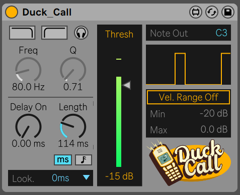 Not everyone uses MIDI notes to trigger their drums, and if you're doing your drums in audio it can be a pain to setup sidechain compression with devices that accept MIDI triggers, such as Duck Buddy. Drop a Duck Call on your audio channel and set the threshold. When the audio level goes above the threshold, a MIDI note is broadcasted.