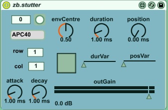 | Description: | This is a granulating device that allows for caputring the buffer to be granulated. It has the usual granulation controls and allows the trigger to be mapped to a controller device pad, made for the APC40 matrix. |