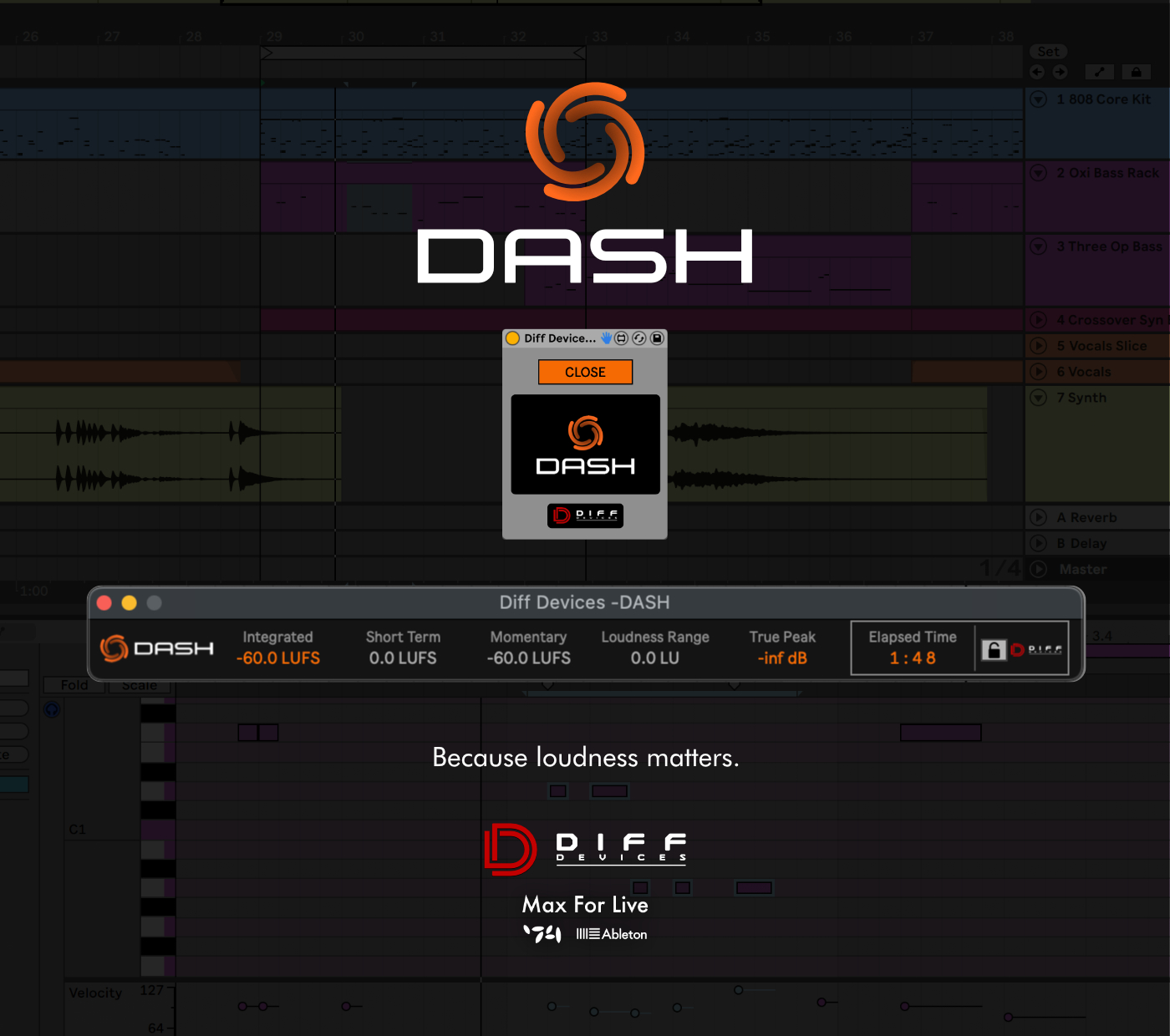 | Description: | DIFF Devices - DASH DASH is a loudness analyser dashboard for Ableton Live. Features: - Loudness Analyser (LUFS, LU & TRUE PEAK) - Elapsed Time Timer - Float window - Lock float window to screen Instalation guide: - Save the .amxd file anywhere on your computer or in a folder that you previously saved your maxforlive devices. - Simply drag the .amxd file as the last device in your MASTER track. (MAC & WIN) * Only works in Ableton Live with Max installed. * It Requires Ableton Live V11 (minimum). |